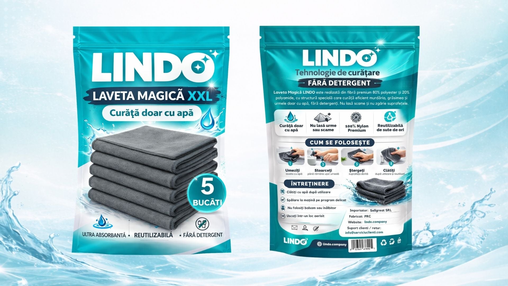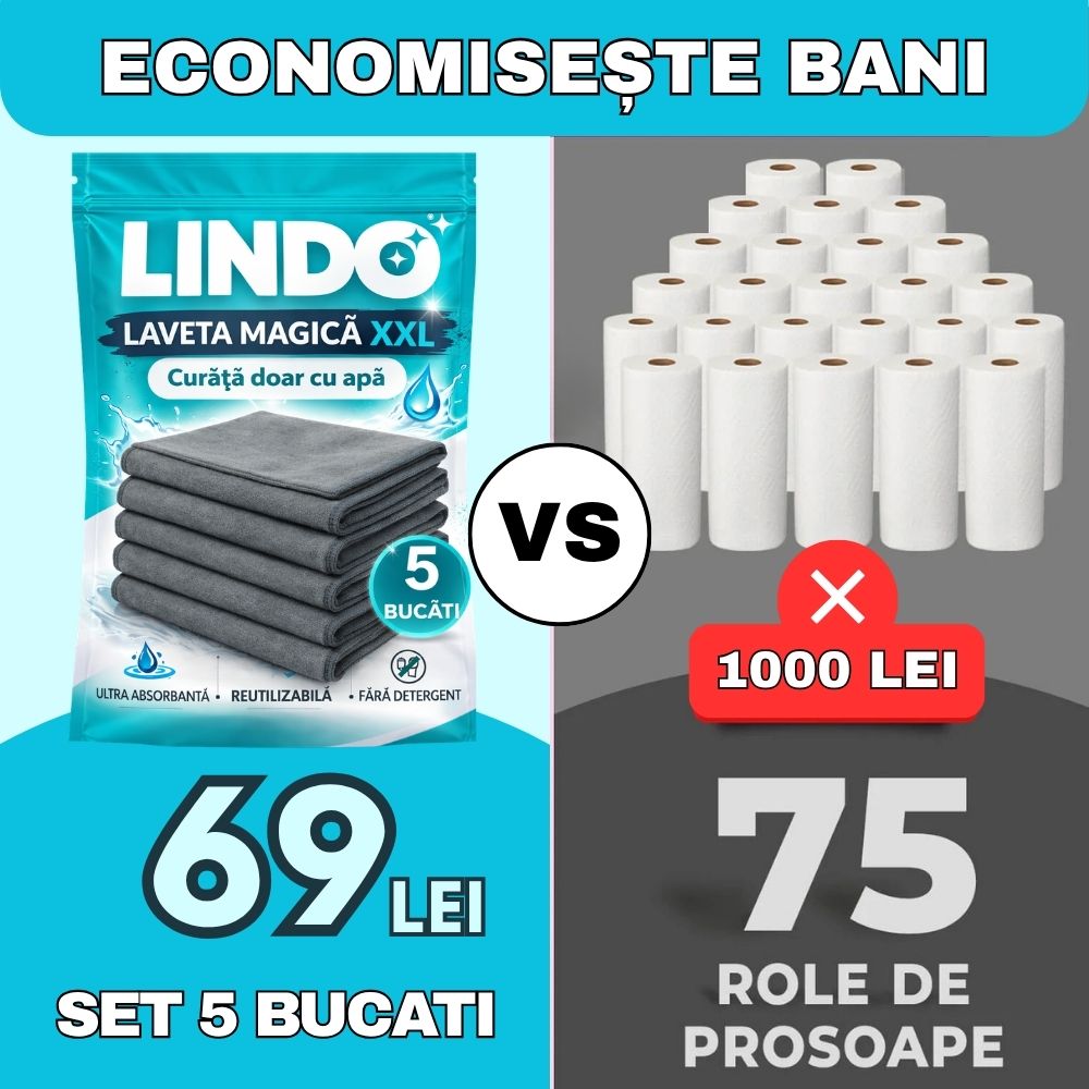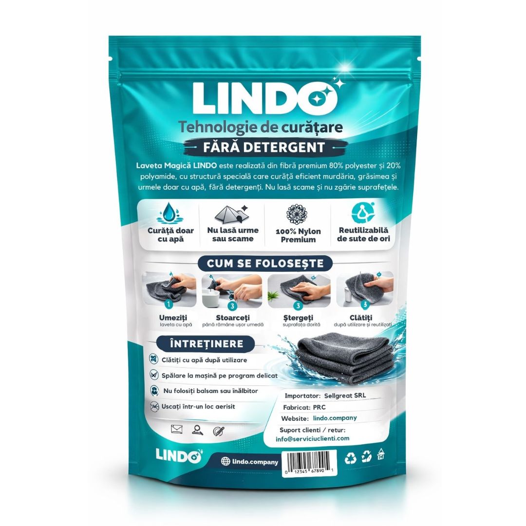Da. Datorită structurii speciale a fibrei, laveta LINDO îndepărtează murdăria, grăsimea și urmele folosind doar apă — fără detergenți sau alte soluții.